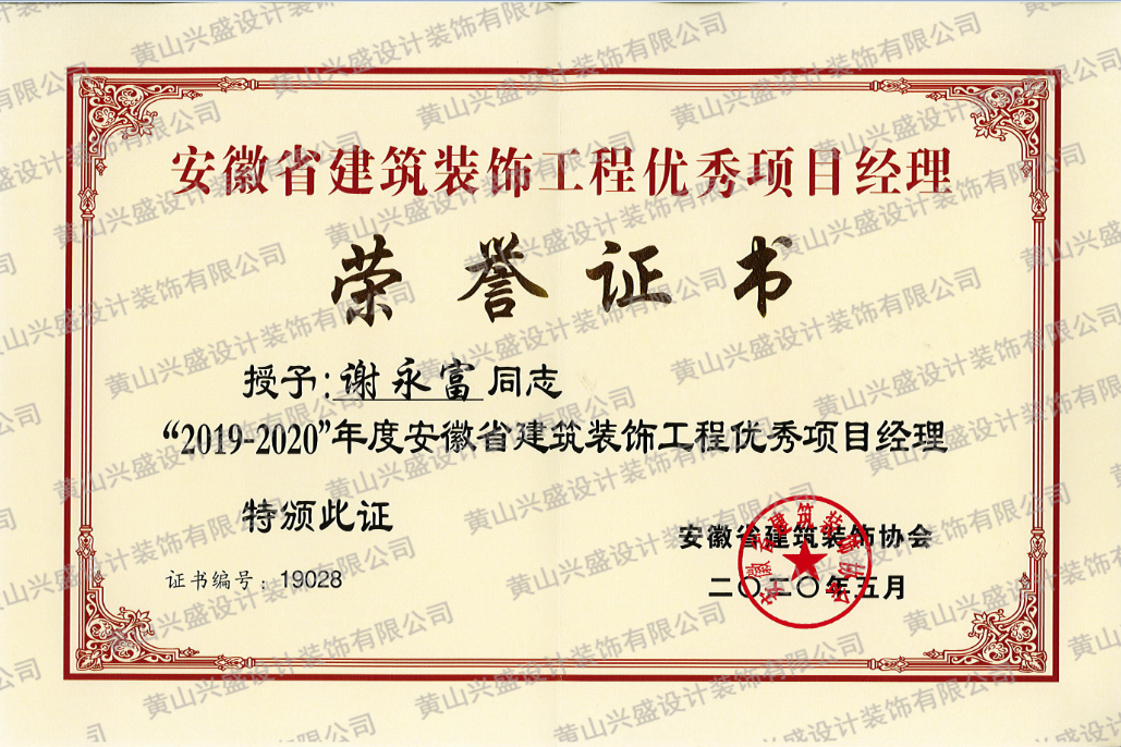 慶祝興盛裝飾榮獲“2019年度黃山市優(yōu)秀建筑業(yè)企業(yè)”獎(jiǎng),公司項(xiàng)目經(jīng)理謝永富、胡龍祥榮獲“2019年度黃山市建筑業(yè)企業(yè)優(yōu)秀項(xiàng)目經(jīng)理”獎(jiǎng)。